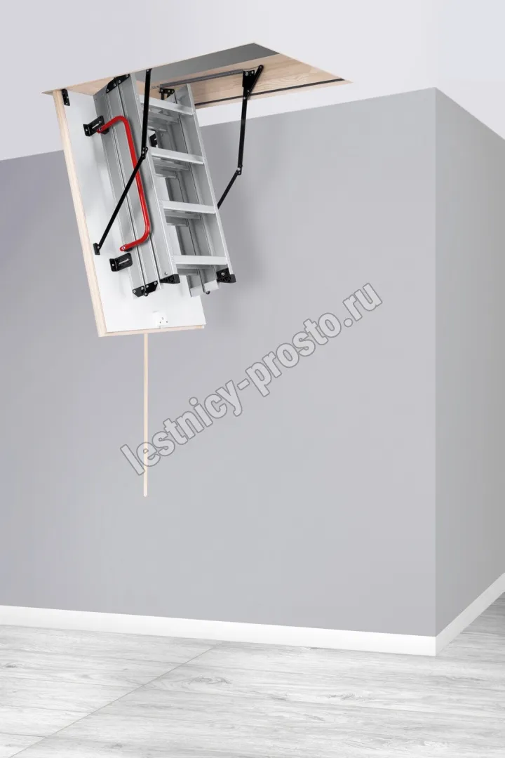 Складная 3-х секционная чердачная лестница. Рабочая поверхность полностью выполнена из алюминия. Термоизоляционная крышка типа "сэндвич" имеет усиленную теплозащиту, облицована с двух сторон ДВП белого цвета. По контуру короба имеется уплотнитель; Все металлические элементы лестницы покрыты порошковой краской.