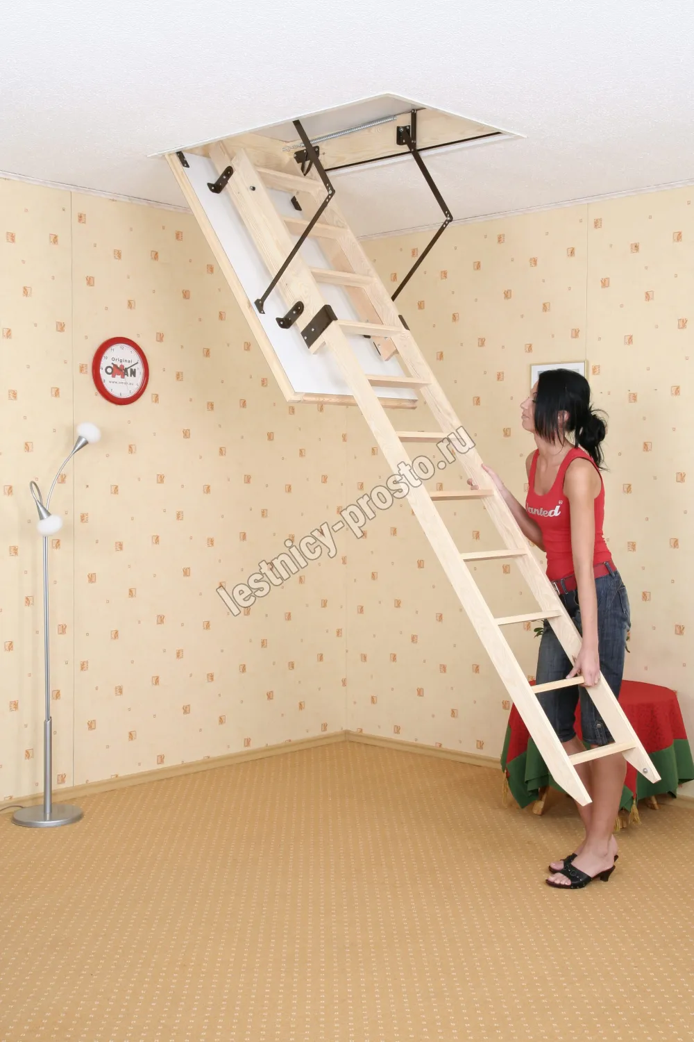 Лестница раздвижная двухсекционная, изготовлена из сосны. Термоизоляционная крышка типа "сэндвич" имеет усиленную теплозащиту, облицована с двух сторон ДСП белого цвета. По контуру короба имеется уплотнитель. Все металлические элементы лестницы покрыты порошковой краской, ступени лестницы имеют антискользящие насечки и закреплены в столярное соединение «ласточкин хвост», что позволяет выдерживать нагрузку 150 кг. При раскладывании лестницы нет вылета за пределы короба, что позволяет использовать эту модель лестницы в таких помещениях, где невозможно использовать чердачные лестницы с большим разбегом открытия. Удобна для эксплуатации на большой высоте. Деревянный стержень для открывания лестницы в комплекте..