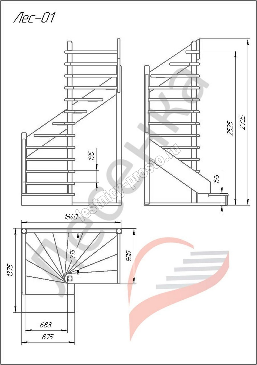 Деревянная межэтажная лестница ЛЕС-01 2525-2720 проем 1640-900, Сосна