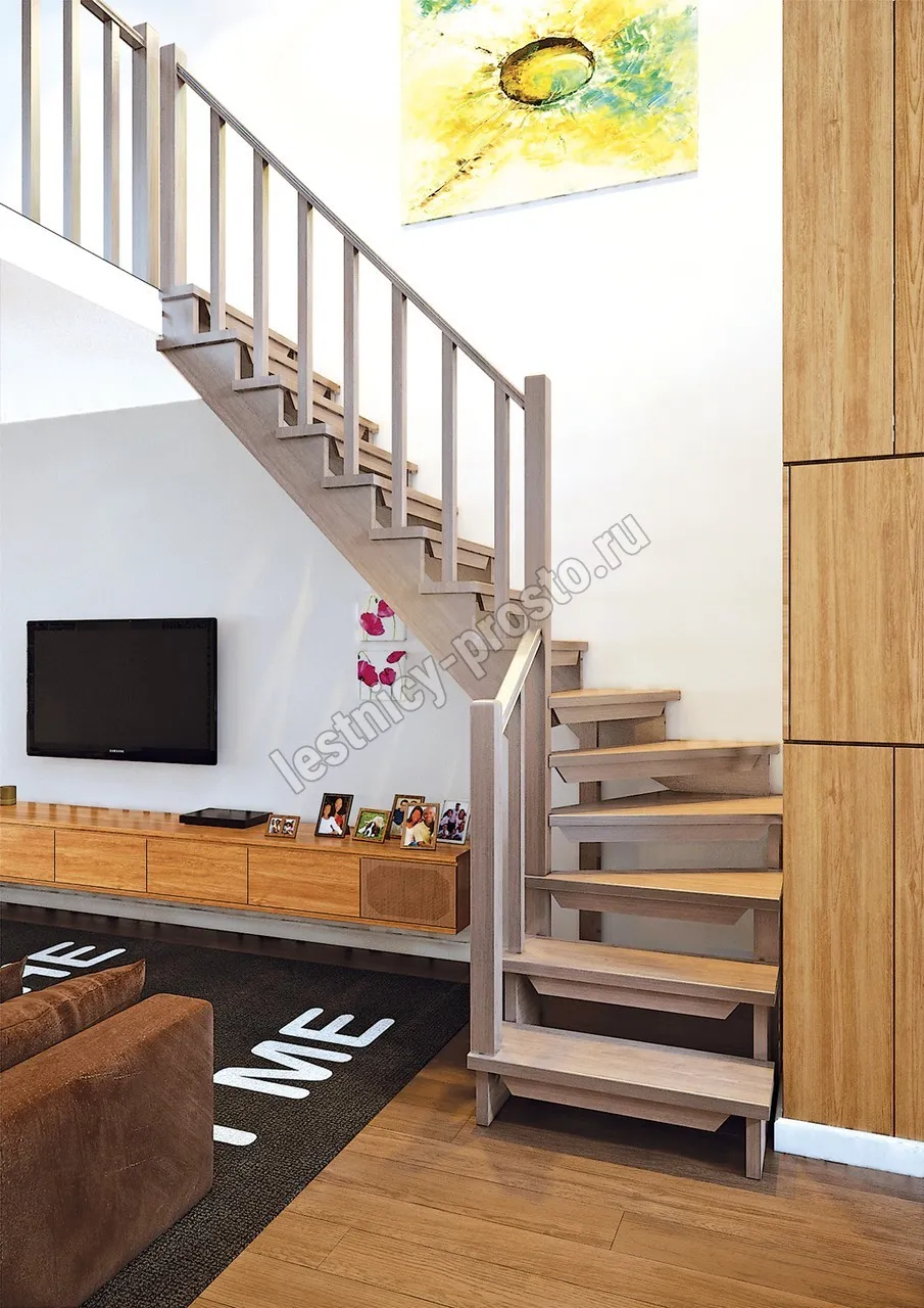 Удобная лестница на косоурах с поворотом на 90 градусов. Открытые ступени визуально облегчают конструкцию. Ограждения по всему маршу обеспечивают дополнительную безопасность и возможность декорирования. Монтаж осуществляется силами двух человек на объекте по указаниям, приведенным в паспорте на лестницу.