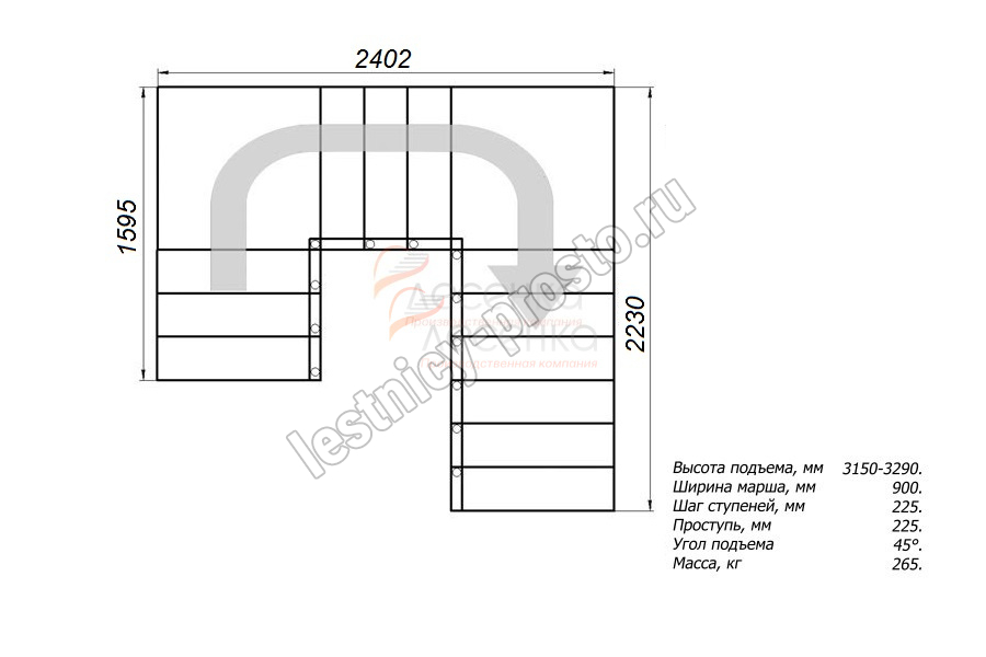 Модульная лестница Комфорт 225 3150-3290, Серый, Сосна, Нержавеющая сталь