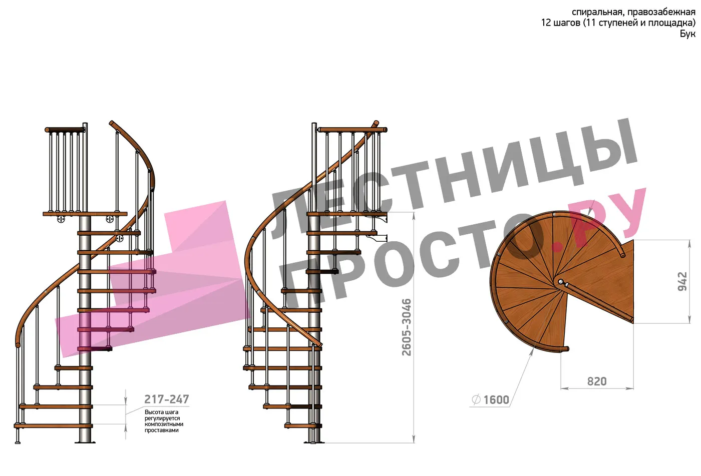 Решение о направлении поворота принимается при сборке лестницы - универсальная конструкция позволяет собрать правозабежную и левозабежную лестницы. Высота ступеней регулируется с шагом 3 мм. в пределах 217-247 мм., благодаря чему, лестница прекрасно подгоняется под необходимую высоту.