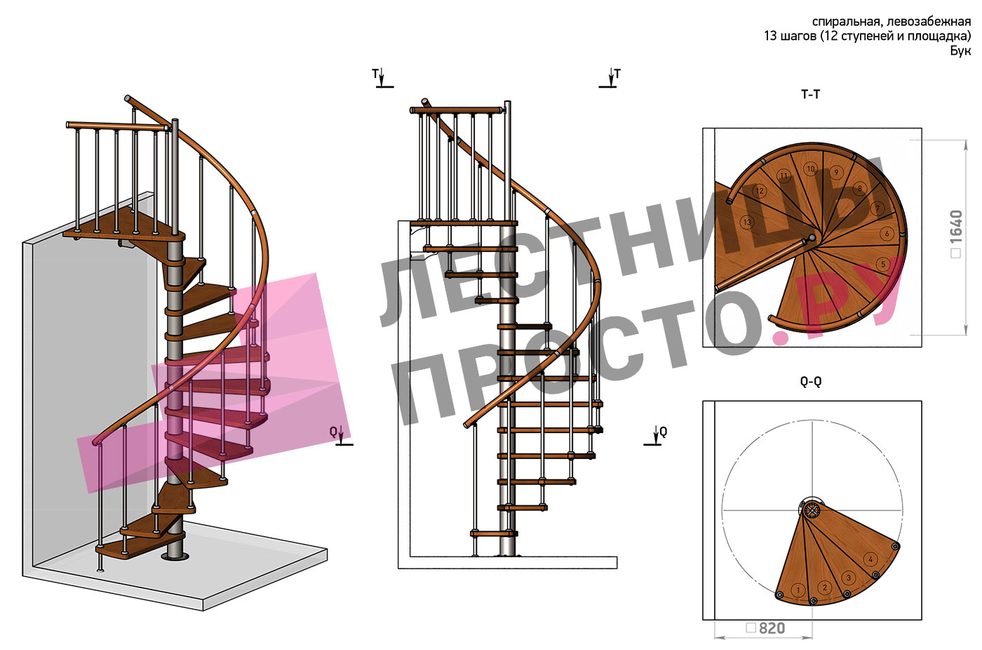 Ширина ступени между центральной колонной и поручнем ≈ 680 мм