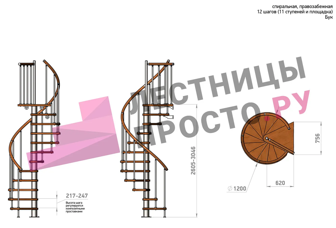 | Винтовая лестница Prosto Spiral Black D120см, h260.5-304.6 см, бук |