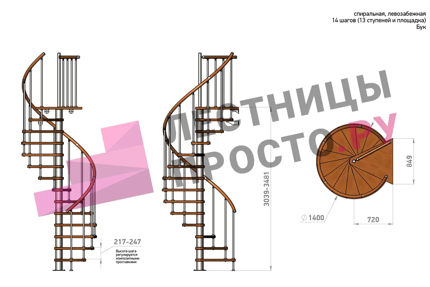 | Винтовая лестница Prosto Spiral Black D140см, h260.5-304.6 см, бук |
