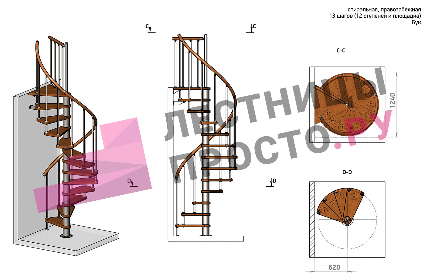 Винтовая лестница Prosto Spiral White D120см, h325.7-369.8 см, бук |