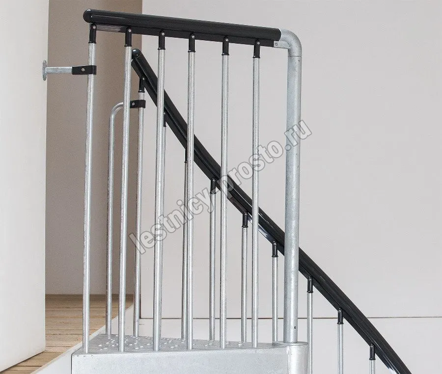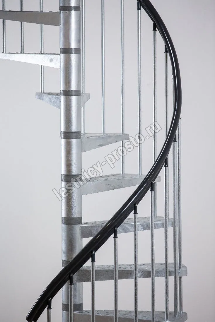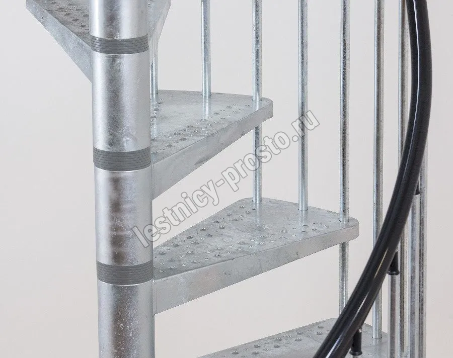 Металлическая винтовая лестница с металлическим поручнем и площадкой. Лестница монтируется как по часовой стрелке, так и против нее. Предназначена для использования внутри помещения или снаружи. На ступенях противоскользящие насечки. Лестница изготовлена из оцинкованной стали.